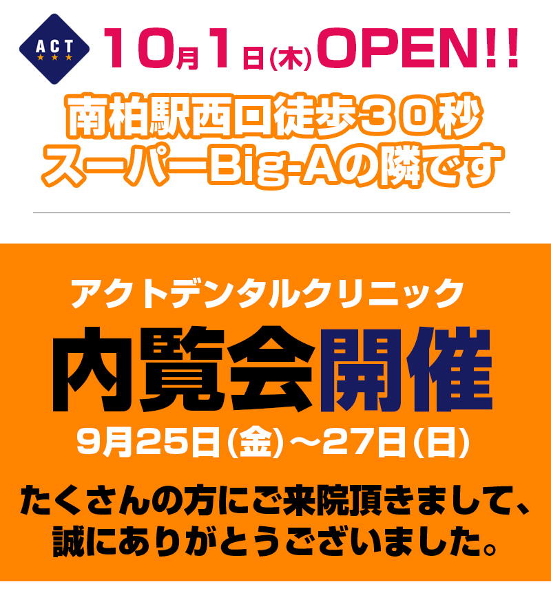 南柏 歯医者 常磐線南柏駅西口駅前徒歩30秒にある歯科医院(歯医者)のACTデンタルクリニック 公式ホームページです。歯の事でお困りの事がありましたら、お気軽にご相談下さい。